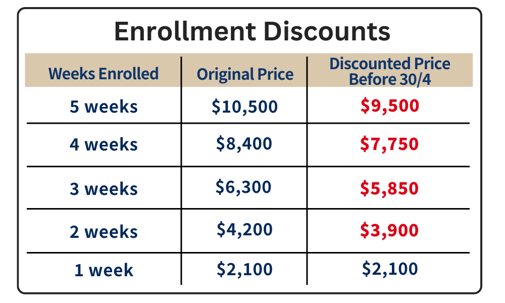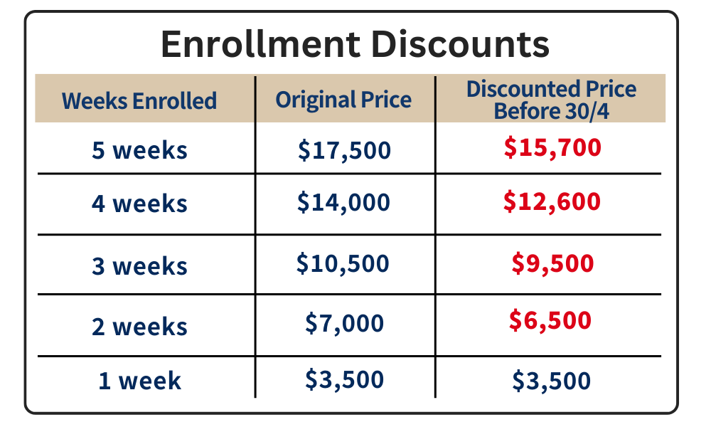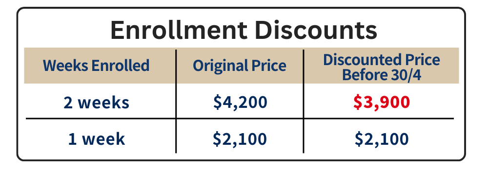 Enrol for 2 courses (each worth $6,900) in the same 3 weeks: Pay only $12,600